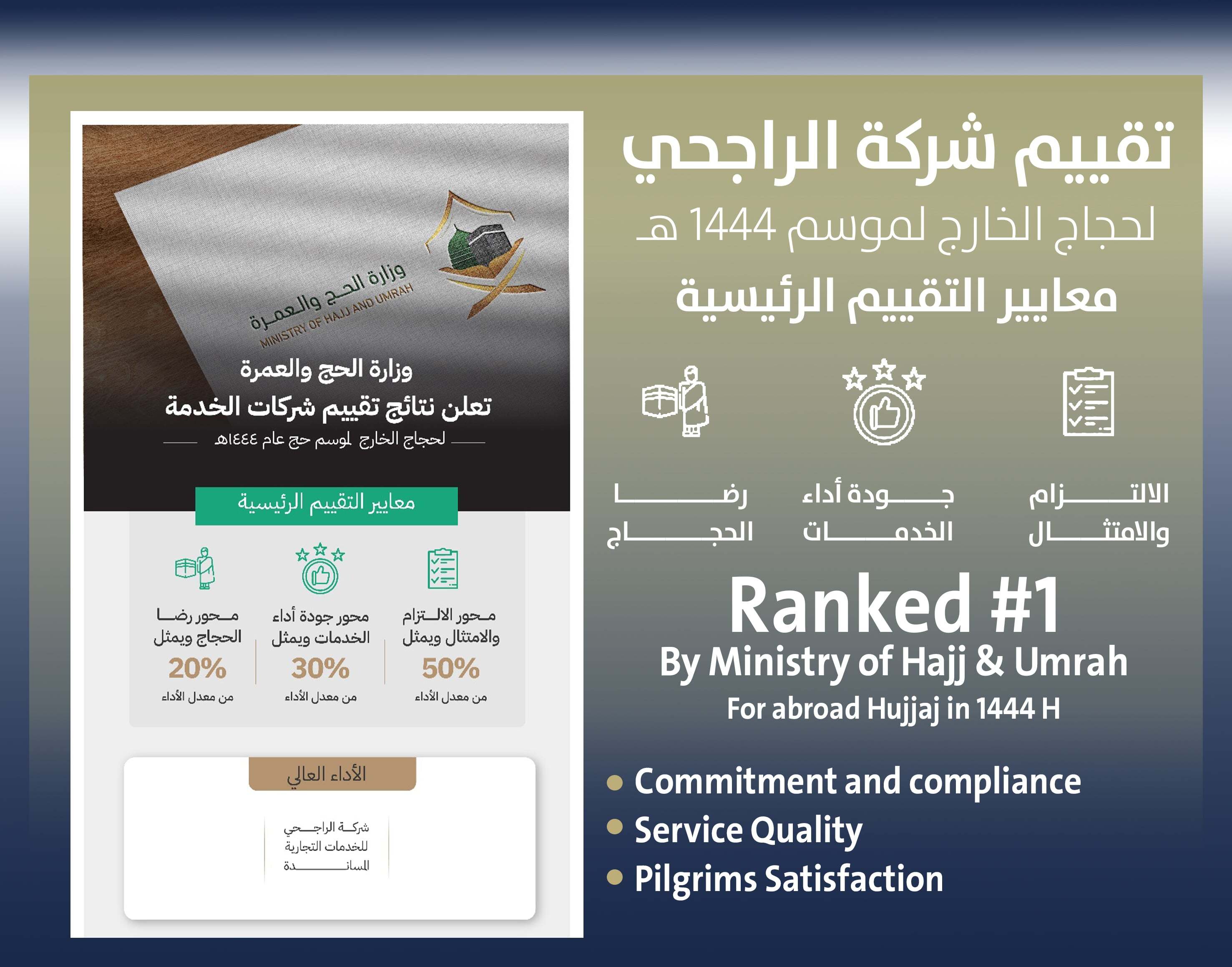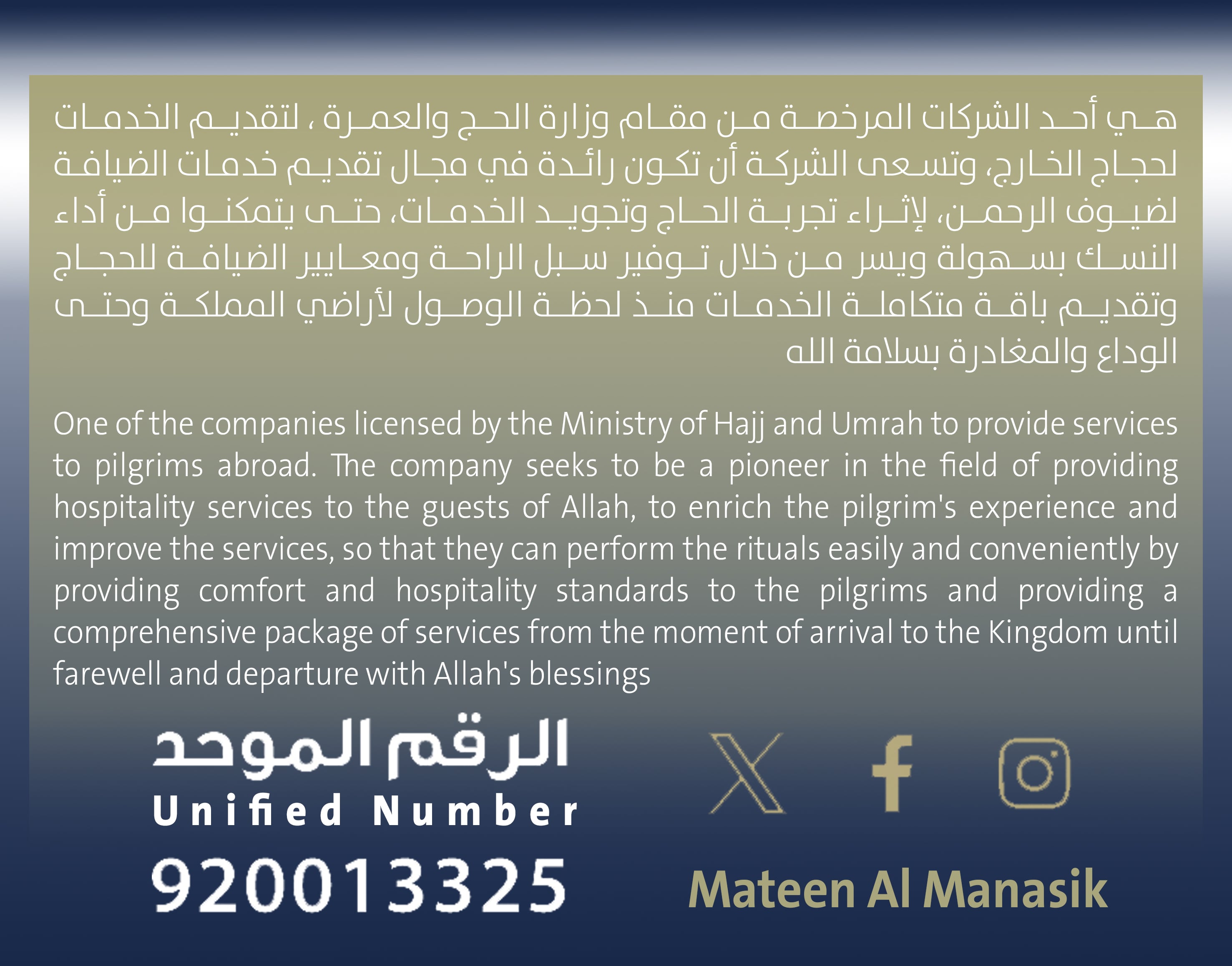 One of the companies licensed by the Ministry of Hajj and Umrah to provide services to pilgrims abroad. The company seeks to be a pioneer in the field of providing hospitality services to the guests of Allah, to enrich the pilgrim's experience and improve the services, so that they can perform the rituals easily and conveniently by providing comfort and hospitality standards to the pilgrims and providing a comprehensive package of services from the moment of arrival to the Kingdom until farewell and departure with Allah's blessings
